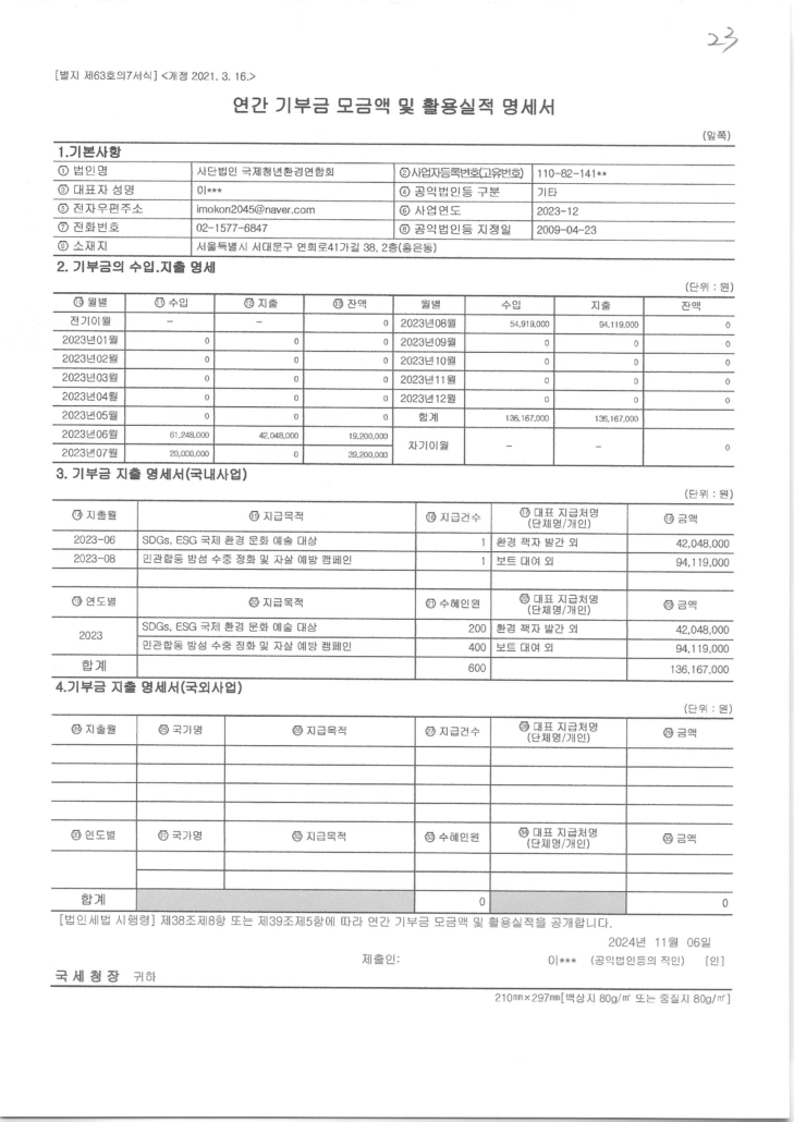 (사)국제청년환경연합회의 2023년 8월 31일까지 기부금 모집 현황을 첨부 파일로 공지합니다.