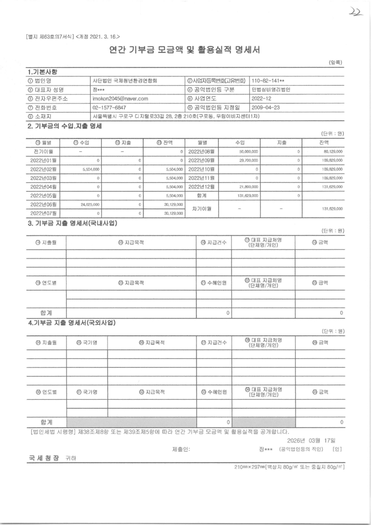 (사)국제청년환경연합회의 2022년 기부금 모집 현황을 첨부파일과 같이 공지합니다.